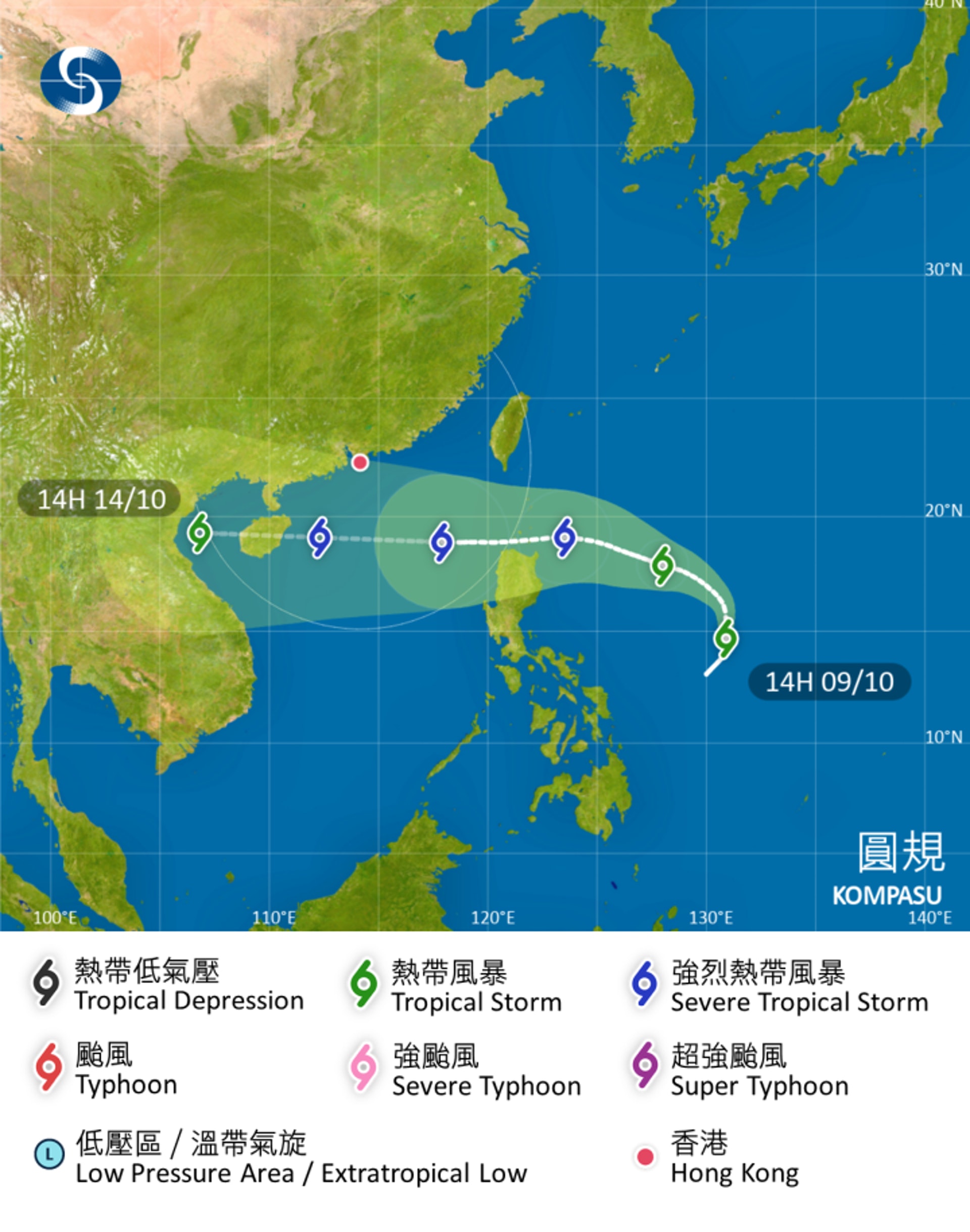2021年太平洋颱風季泛指於2021年全年內的任何時間於赤道以北及國際換日線以西的太平洋水域以及南中國海所產生的熱帶氣旋 雖然沒有指定的形成時間但大部份於西北太平洋的熱帶氣旋通常皆會於5月至12月期間形成. 獅子山颱風圓規颱風將接力生成圖翻攝自氣象局 氣象專家賈新興在其yt頻道分析10月10日後是否有秋颱共伴的可能性他指出. 熱帶氣旋圓規周三13日更接近香港將吹清勁6級東至東北風離岸及高地達烈風程度8級即8號風球風力雨勢有時頗大惡劣天氣將延至周四14日重陽節 獅子山吹襲下香港市況 1 718早上暴雨過後多區出現彩虹 4.