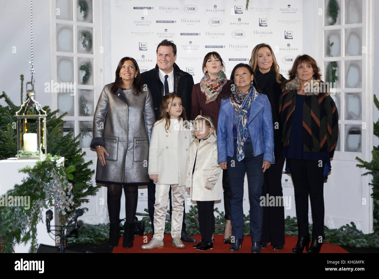Paris Frankreich November 2017 Nolwenn Leroy Umgeben Von Anne Hidalgo Benjamin Cymerman Sandrine Quetier Jeanne D Hauteserre Und Stephanie Fugain Beleuchtet Die Rue Du Faubourg Saint Honore Und Startet Den Betrieb Winter Time 2017